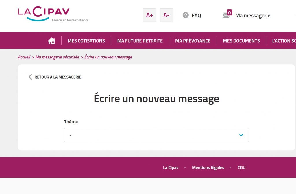 A ce moment là, vous pourrez aller dans la messagerie de votre espace CIPAV et envoyer un message avec le thème et l’objet pré-remplis le thème et objet qui vous seront communiqués sur votre appel de cotisations 2020.