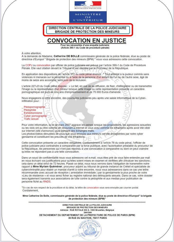 Notons que les noms évoqués , Catherine De Bolle et Myriam Quéméner, sont des personnes qui existent et travaillent dans ce domaine ( https://fr.wikipedia.org/wiki/Catherine_De_Bolle et https://cybercercle.com/bios/myriam-quemener/). Mais un document officiel de convocation ne les nommerait pas et surtout ne mettrait pas leurs noms en gras ..