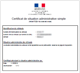 Le certificat de situation administrative doit être établi depuis moins de 15 jours et doit être accompagné du certificat d’immatriculation (ex carte grise) à remettre à la casse auto agréée ou à l’épaviste auto agréé.