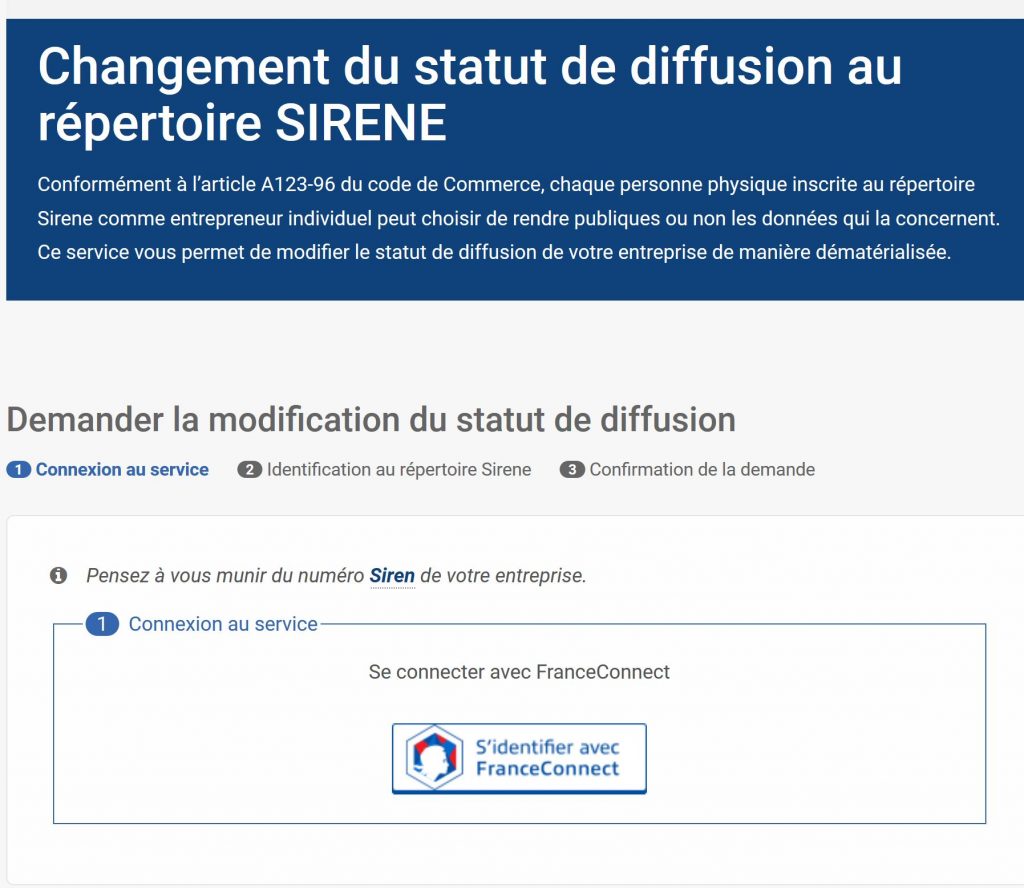 Il faut tout d’abord vous connecter sur le site spécifique Insee Sirene pour changer de statut: https://statut-diffusion-sirene.insee.fr/