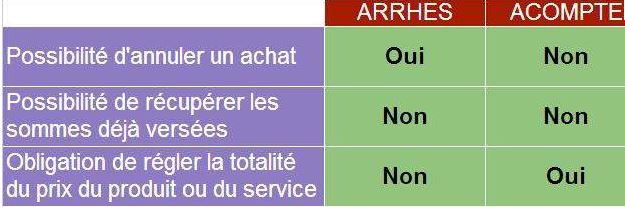 Le site economie.gouv.fr donne comme petit astuce pour se souvenir de la différence: « arrhes, je peux arrêter » ;« acompte, je dois continuer« .