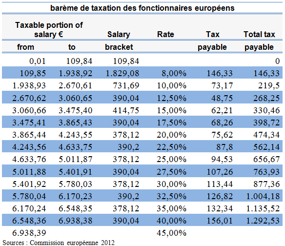 La tranche d’imposition la plus haute pour les fonctionnaires européens est de 45% (elle est de 43% en Italie, 45% en Allemagne, 50% au Royaume-Uni, 52% en Espagne et aux Pays-Bas et de 75% en France).