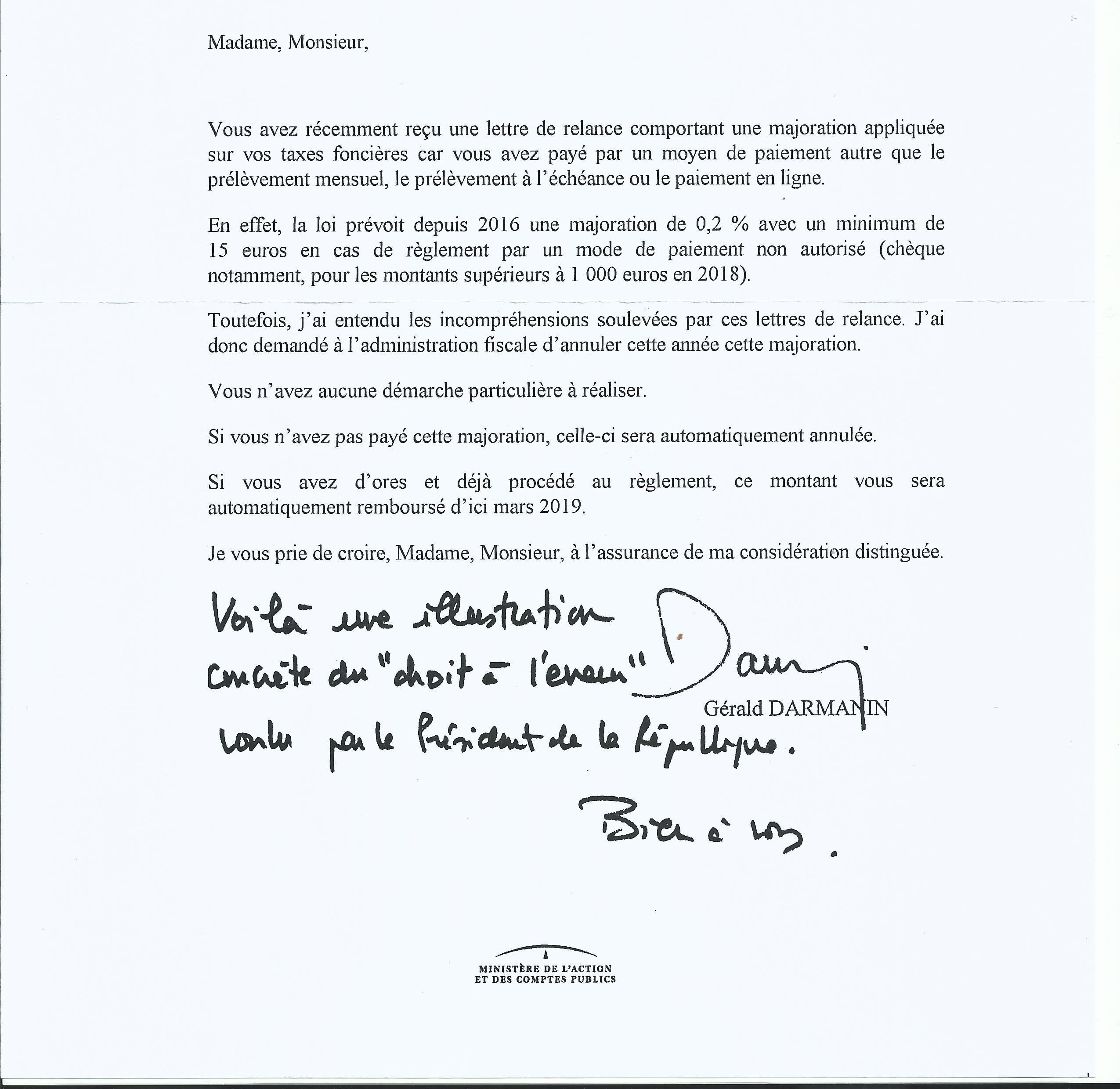 Le ministre se permet d’indiquer en « manuscrit » qu’il s’agit d’une illustration du droit à l’erreur voulu par E Macron ..