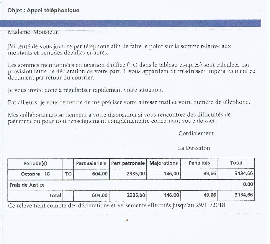 Sans jamais avoir réclamé quoi que ce soit et ayant TOUS les papiers nécessaires en sa possession, l’URSSAF réclame une somme délirante en regard du salaire versé (un brut de 1400 euros) et y ajoute directement des majorations et pénalités.
