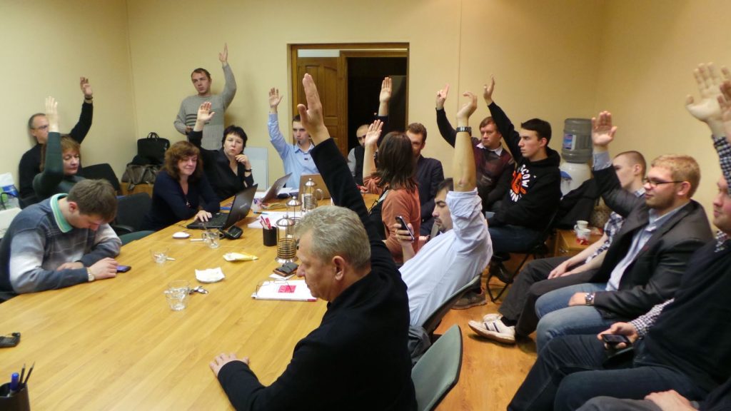 Lors de l’AG, après décompte des présent, des absents et des pouvoirs (et attribution de ceux-ci, dans certaines limites, aux personnes présentes pour les pouvoirs en blanc), on élit un président de séance, un secrétaire et on passe en revue l’un après l’autre les points.